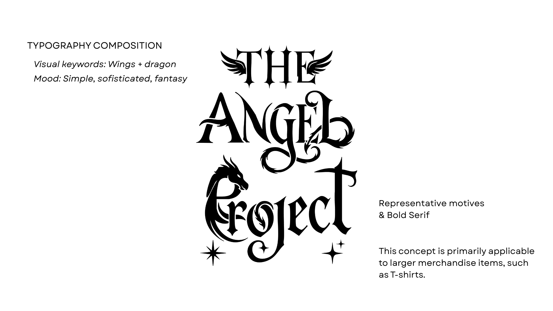 El desafío consistía en traducir la compleja narrativa visual de The Angel Project —originalmente una portada densa y detallada— en una serie de activos gráficos optimizados para merchandising. Para resolver la preocupación del cliente sobre la durabilidad en impresión textil y serigrafía, sinteticé los elementos clave (el ángel y el dragón) en tres propuestas de line-art y gráficos minimalistas desarrollados en Photoshop. Al reducir la densidad visual y eliminar detalles excesivamente finos que suelen degradarse con los lavados, logré diseños limpios y de alto impacto que mantienen la esencia de la obra, garantizando una reproducción técnica impecable en soportes como camisetas y tazas.