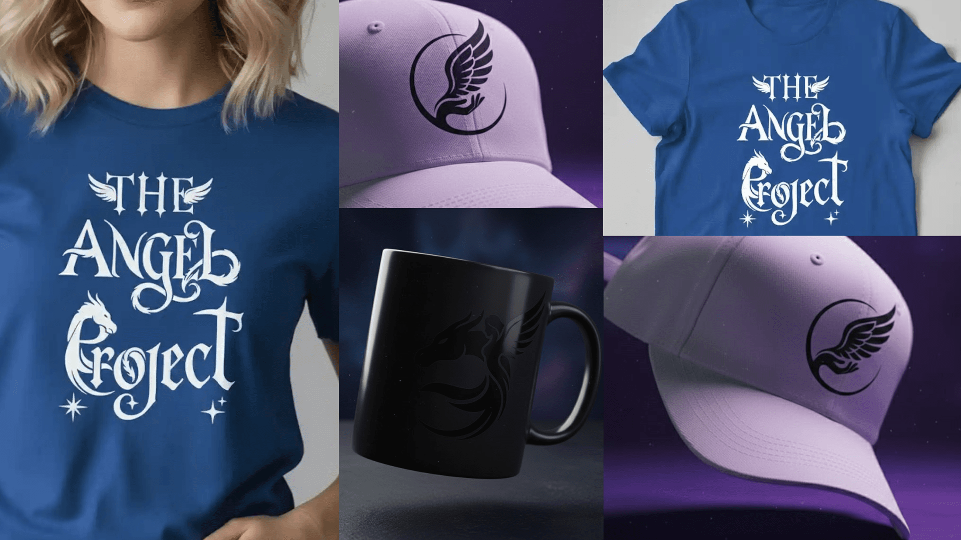 Design Solution: The challenge was to translate the complex visual narrative of The Angel Project —originally a dense and highly detailed cover— into a series of graphic assets optimized for merchandise. To address the client's concerns regarding durability in textile and silkscreen printing, I synthesized the key elements (the angel and the dragon) into three minimalist line-art and symbolic designs developed in Photoshop. By reducing visual density and removing overly fine details that typically fade with washing, I created clean, high-impact graphics that preserve the book’s essence while ensuring flawless technical reproduction on items such as t-shirts and mugs.