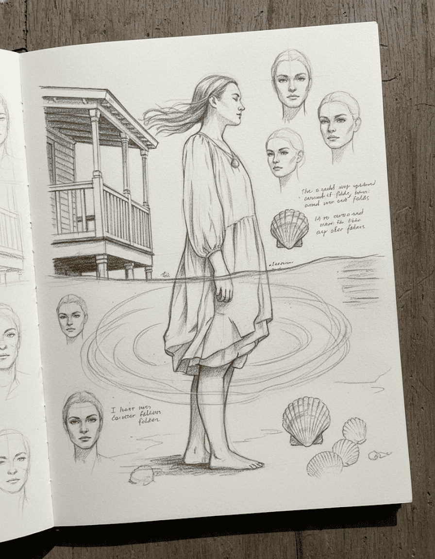 The artistic process began with detailed graphite sketches in a sketchbook, where anatomy, facial expressions, and the drape of the fabrics were carefully studied to capture the protagonist's essence. Subsequently, the illustration evolved into a mixed technique that combines the precision of line drawing with the fluidity of watercolor, allowing for the creation of that translucent effect in the water and the swirls of light surrounding the figure.
